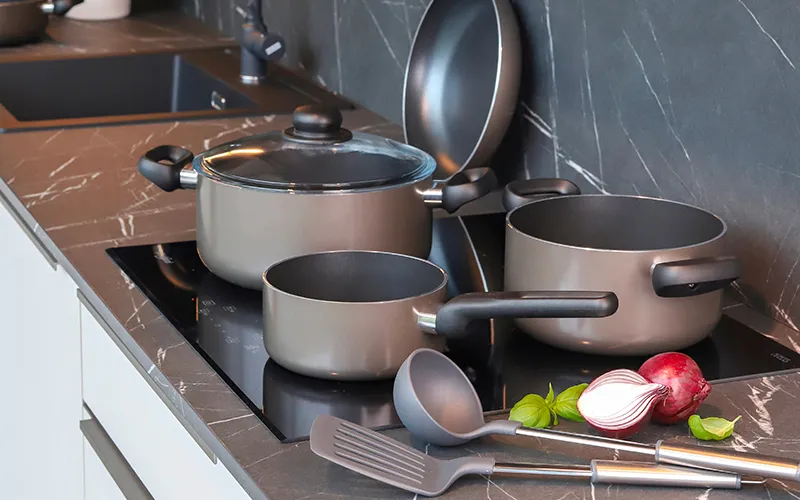 Brava is a complete line of metal pots, pans and saucepans with an efficient non-stick coating that helps cook food with very little added fat. The thick bottom, which makes cookware suitable for induction cookers, distributes heat evenly and promotes energy savings, as it allows to cook at medium or low output and turn it off before cooking is finished, taking advantage of heat retention properties. All pieces in the Brava line are sturdy and easy to handle, with comfortable handles, featured by an elegant, contemporary design made more appealing by the exterior coloring in taupe, a refined warm gray.