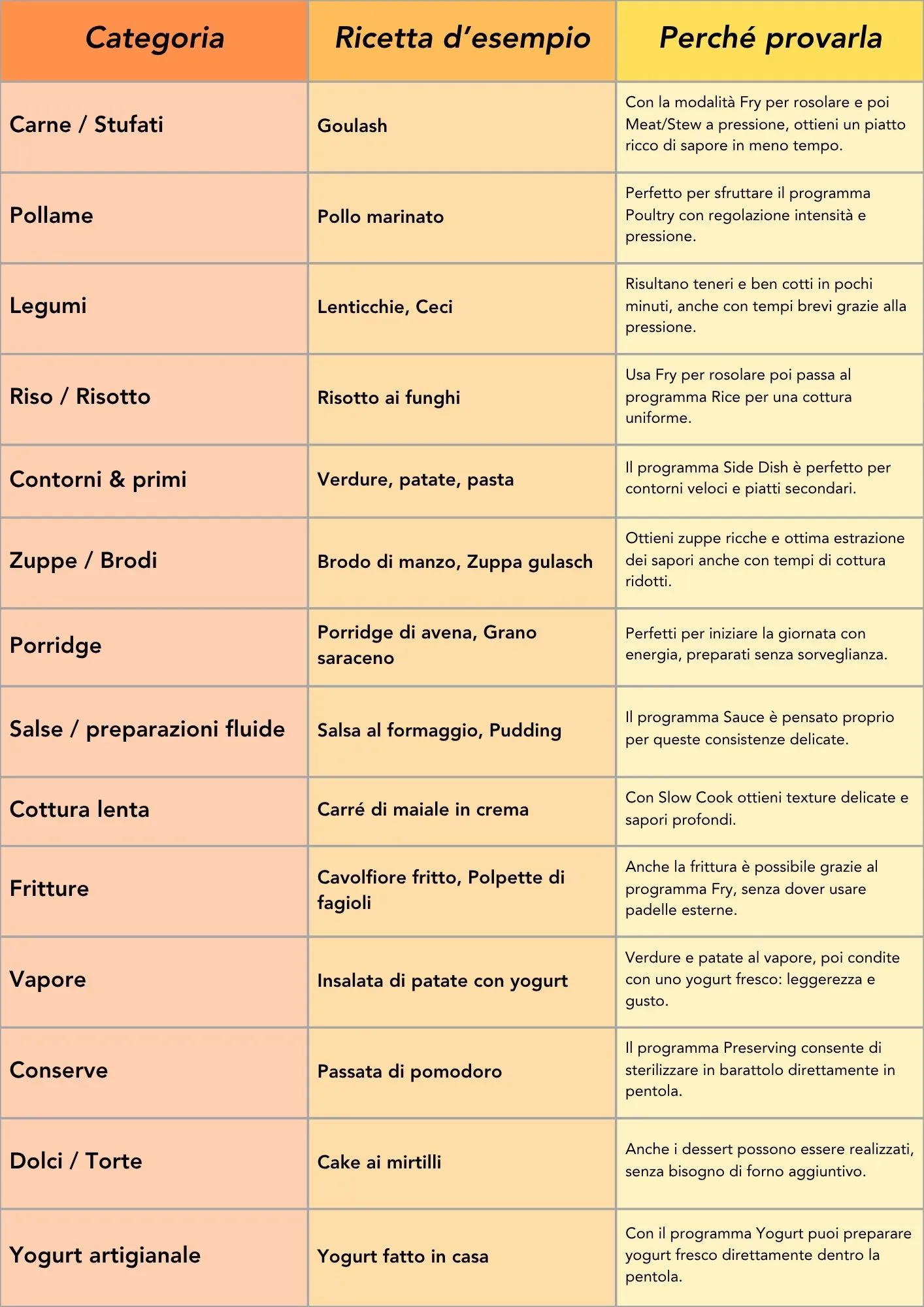 non è solo un elettrodomestico: è una porta aperta su un mondo di possibilità culinarie. Grazie ai suoi programmi automatici e all’ampia gamma di modalità (pressione, slow cook, vapore, frittura, zuppe, yogurt, dolci, conserve) puoi preparare ogni giorno piatti diversi, sani, gustosi e senza fatica.