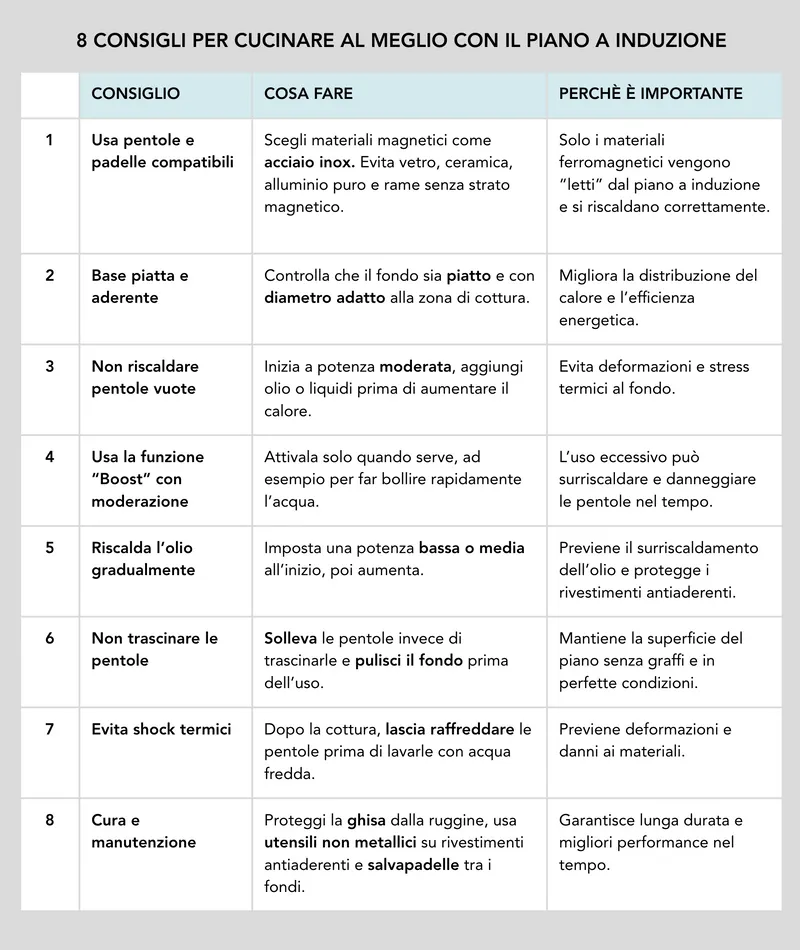 Cucinare con l’induzione è una scelta moderna, efficiente e sicura: basta qualche accorgimento per ottenere il massimo da ogni ricetta e preservare la qualità delle tue pentole nel tempo.
