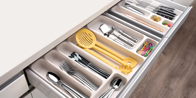 Sfrutta al massimo i tuoi cassetti della cucina grazie ai moduli componibili FlexiSpace. Un sistema modulare componibile che ti permette di personalizzare ogni cassetto in base alle tue esigenze. Inserisci le misure del tuo cassetto e seleziona i moduli in varie misure per posate, coltelli, utensili e piccoli accessori, da unire come vuoi attraverso raccordi e piedini per creare la soluzione perfetta per il tuo cassetto.