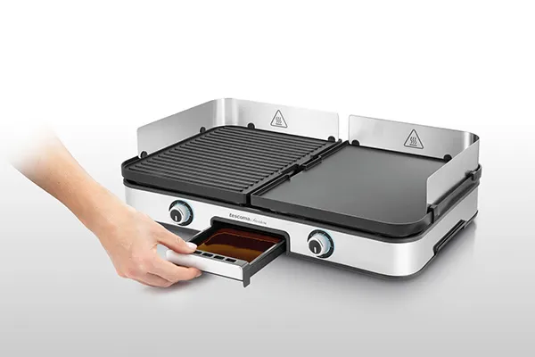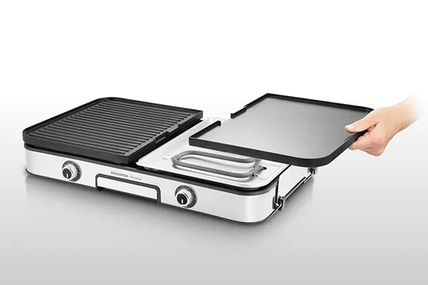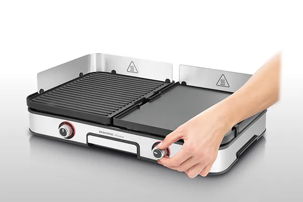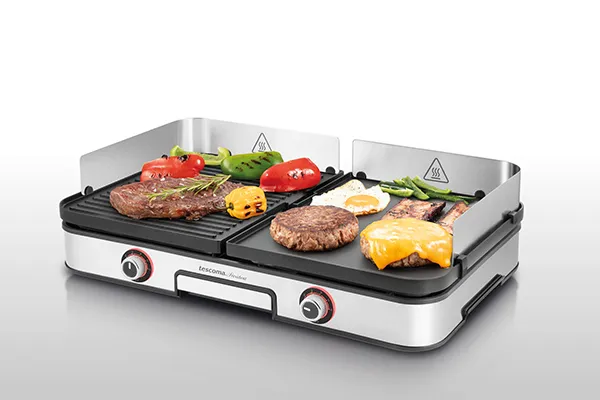 Grill elettrico a due zone provvisto di piastre double face, entrambe con superficie liscia e grigliata e rivestimento antiaderente, per cucinare quello che vuoi in maniera facile e veloce. Promozione riservata ai clienti fidelity valida fino alle 23:59 del 31/08/2025.