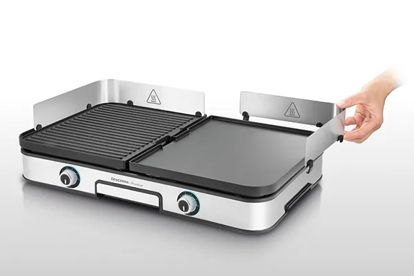 Le sponde di protezione, oltre a proteggere le superfici vicine dagli schizzi, sono removibili per facilitarne la pulizia. Le piastre sono lavabili in lavastoviglie.
