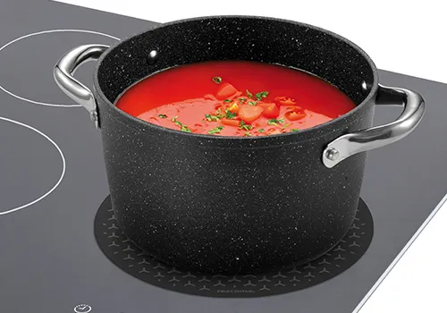 Posizionando il tappetino di protezione al centro della zona a induzione, prima di accendere il piano, puoi cucinare come di consueto senza preoccuparti di sporcare la superficie del piano e con la tranquillità di avere una superficie antiscivolo che rende stabile la padella sul piano cottura.