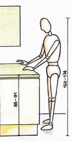 Bisogna sempre ricordarsi che un piano di lavoro per essere funzionale deve essere posto, per persone di altezza media compresa tra 160 cm e 175 cm, generalmente ad un’altezza di 90 cm da terra, stando attenti tuttavia a calibrare questa quota rispetto alle effettive proporzioni fisiche dei fruitori della cucina, per evitare l’assunzione di posizioni scorrette ed eccessivamente faticose. Persone di statura maggiore dovrebbero utilizzare piani tra i 95 ed i 110 cm, mentre persone più basse dovrebbero utilizzare piani tra i 75 e gli 85 cm.