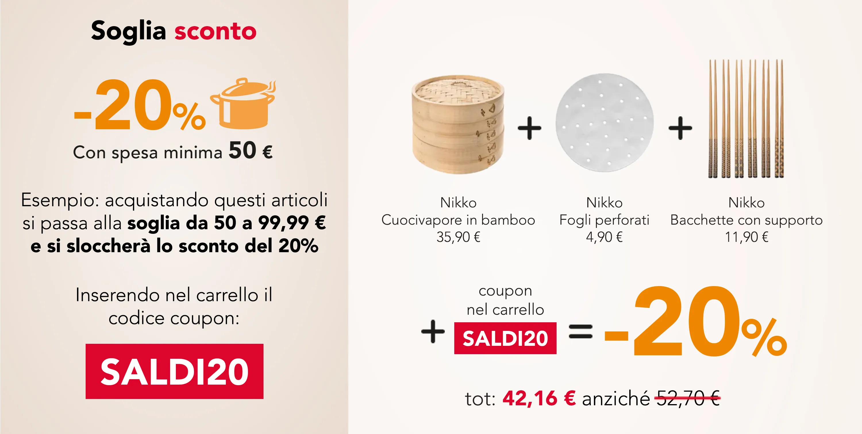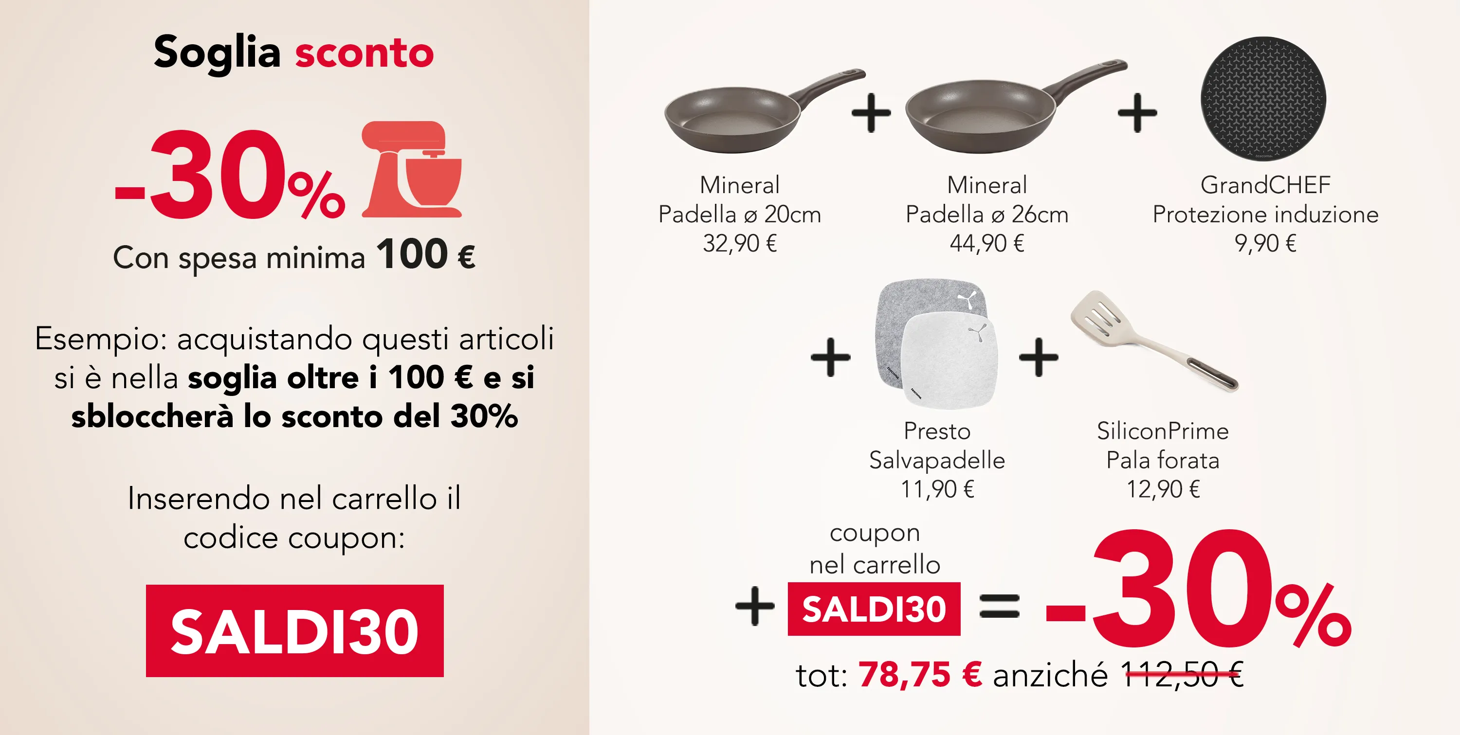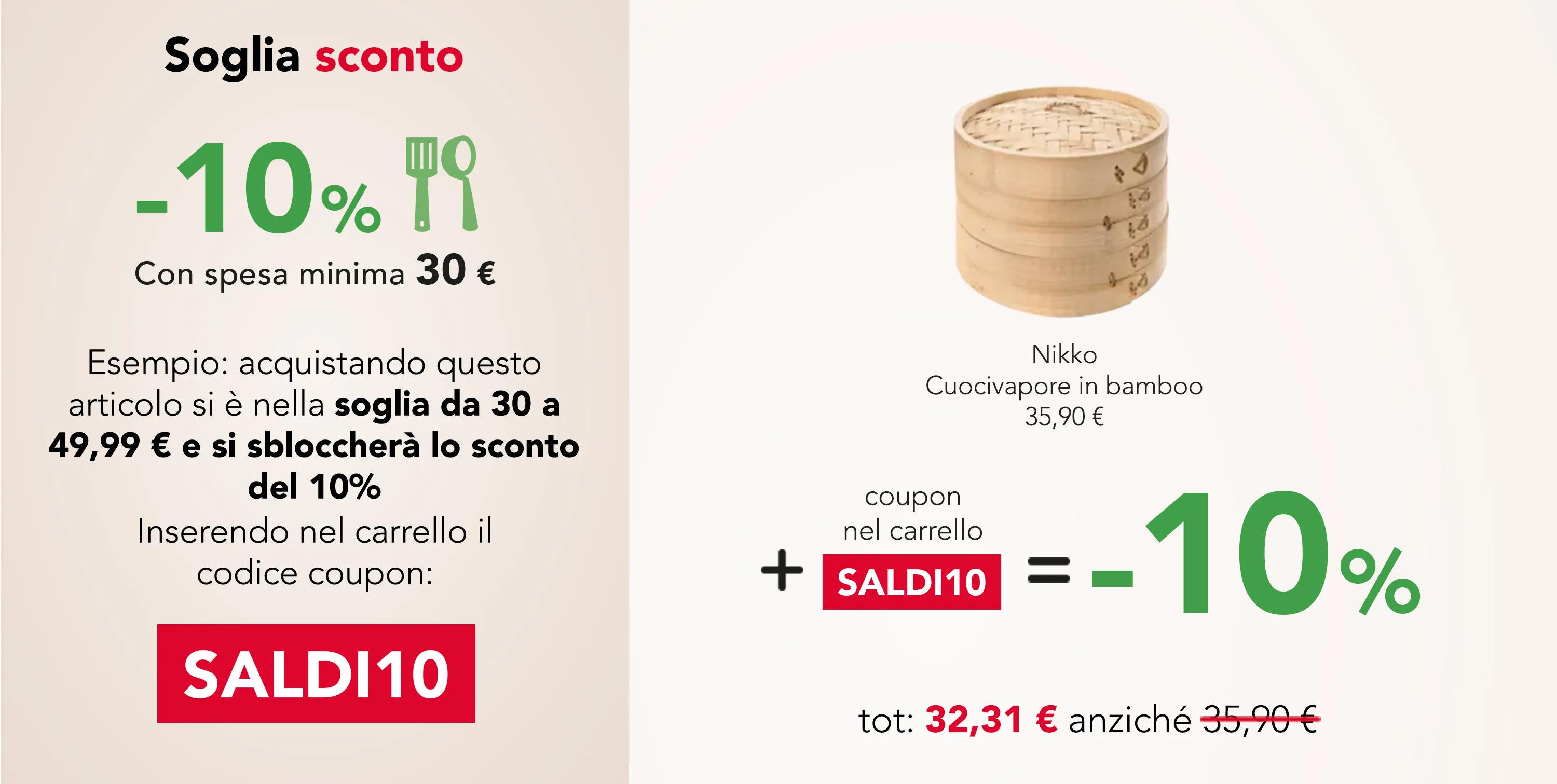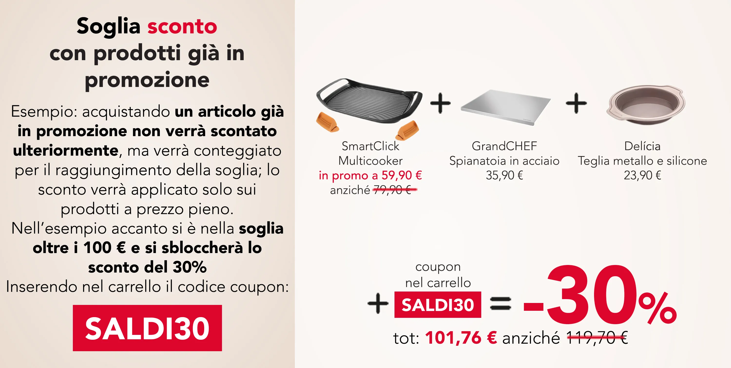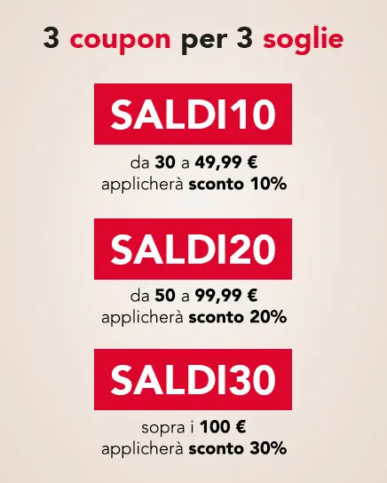 - I 3 coupon per le 3 soglie sono: SALDI10, SALDI20 e SALDI30